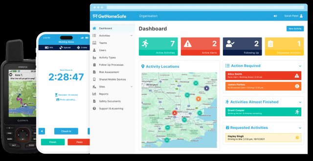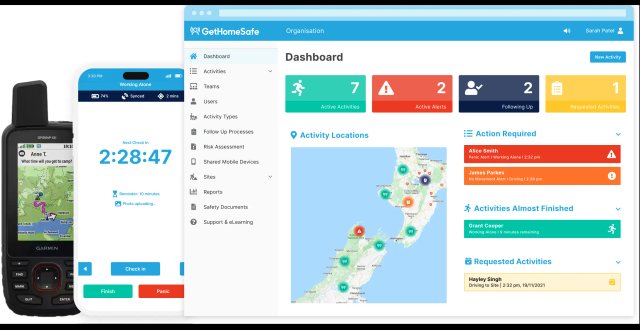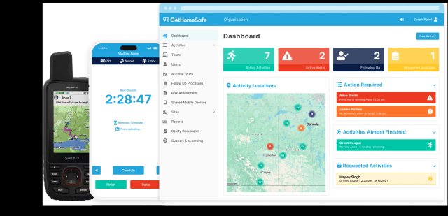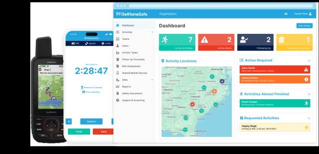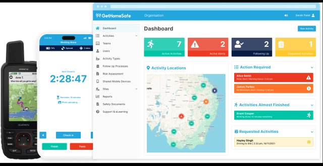 The GetHomeSafe platform unifies automated welfare check-ins, planning, approval and combining multiple feeds of live GPS tracking information and alert activations into one central dashboard.
