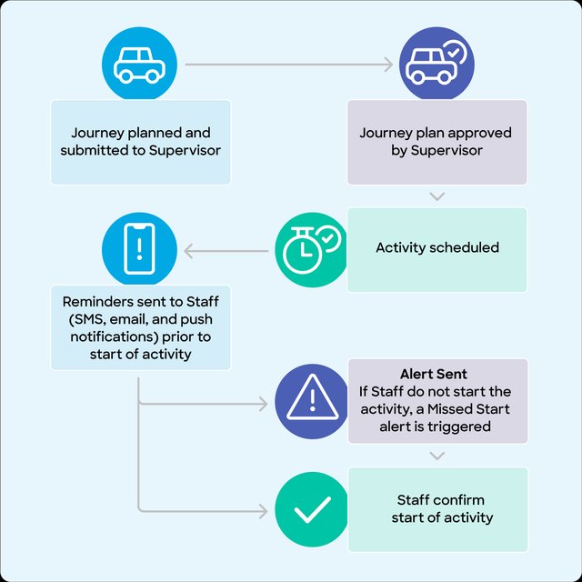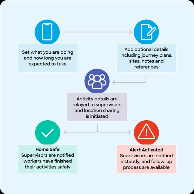GetHomeSafe offers a comprehensive solution for managing safety in various work scenarios, including working alone, remote work, and situations where coverage may be limited. With features like live GPS location sharing, supervisors can track the real-time whereabouts of staff, while mass-messaging capabilities enable swift communication across large teams. Here’s a look at some of the standard workflows.