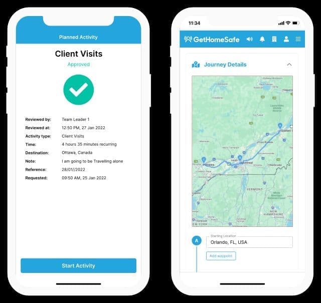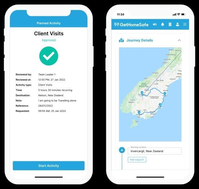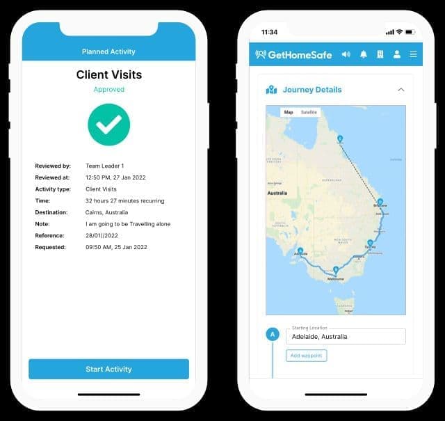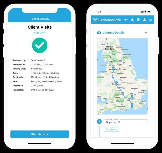 Once approved, GHS will automatically notify the requestor their trip is approved. They can then initiate real-time welfare monitoring of said journey (and working alone while on each site) into one record of the plan, approval, travel, site work and home-safe confirmation.